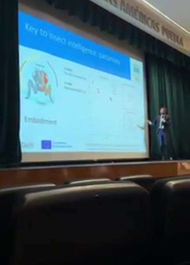 person giving a presentation in an auditorium or lecture hall. The person is wearing a dark suit and a light-colored shirt, and is gesturing towards a large screen displaying a presentation about insect intelligence and drone morphology. The screen has the title "Key to insect intelligence: parsimony," and shows a diagram of an insect, as well as several graphs. The graphs appear to be plotting thrust-to-weight ratio and maneuverability, and controllability. The room is relatively dark, with rows of empty dark leather seats visible in the foreground. The person is standing on a stage in front of a curtain, which is partially drawn to the side. The screen is reflecting light and colors. The presentation includes a reference to "Evolution of Drone Morphology" by Ang, Elijah HW, Christophe De Wagter, and Guido CME de Croon. The bottom left of the screen acknowledges funding from the European Union.