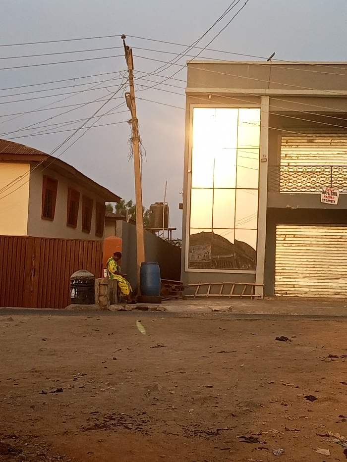 A seated person in a patterned yellow garment occupies the street corner by a fenced building, a blue barrel, and utility equipment. Adjacent is a modern building with mirrored panels reflecting the environment. A wooden ladder lies against its base. Overhanging electrical wires extend from a weathered utility pole towards the top-left corner. The ground is uneven, and the sky fades into a pale evening hue.