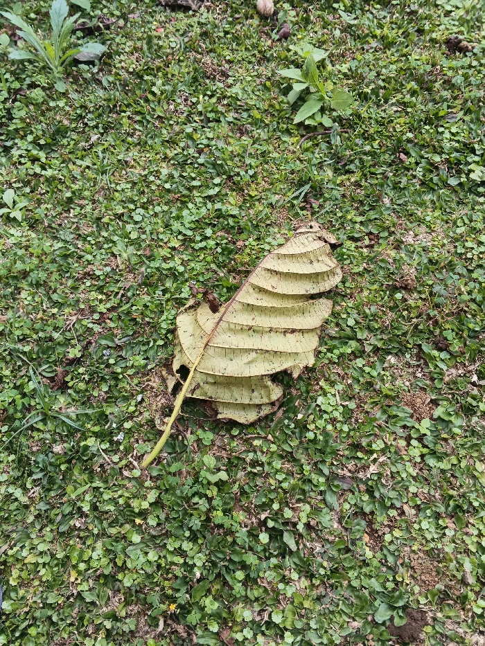 - "A dry, curled leaf with distinct rib-like segments lies on a dense green ground cover" by FM-sxdq72, licensed under CC BY 4.0