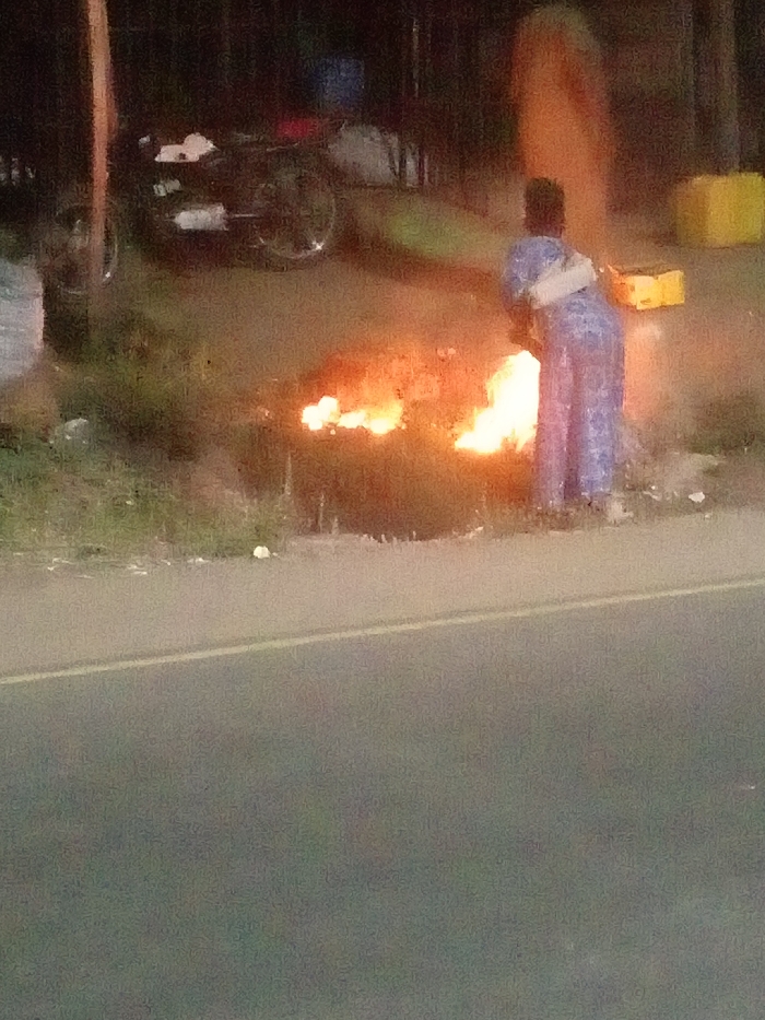 A person stands beside a roadside fire. They wear patterned blue pants and a white top. A motorcycle is parked on a dirt area behind the person and fire. Yellow containers sit further back on the dirt. The road is in the foreground, with a blurry background of trees and light.