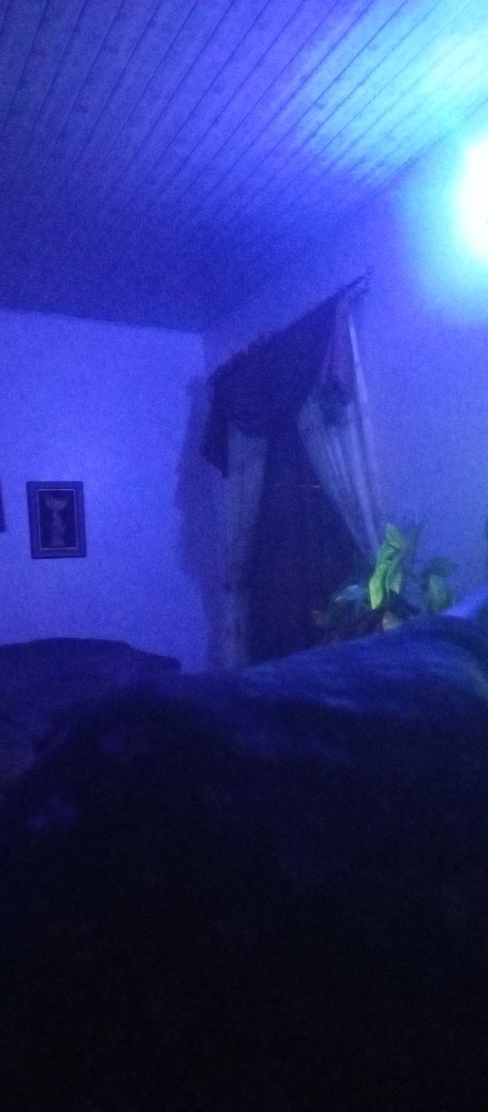 An interior bathed in blue light reveals a room with a low, wood-paneled ceiling. A bed or large object dominates the foreground, its details obscured by darkness. On the wall, a framed picture hangs to the left of a curtained doorway. A leafy plant adds a touch of nature. The overall scene is dimly lit, creating a somewhat mysterious ambiance.