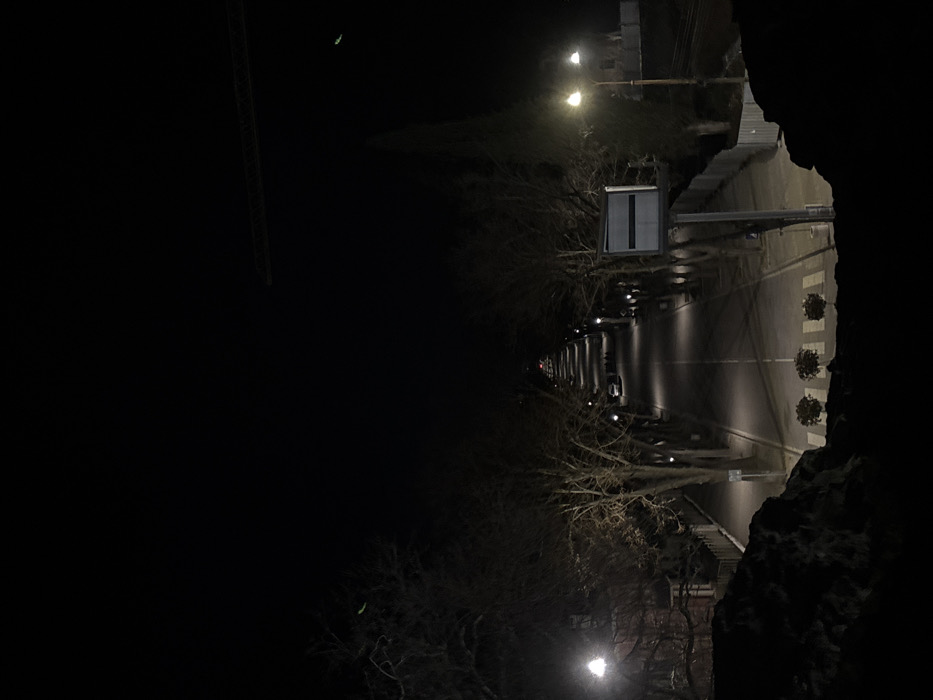 The image presents a nighttime street scene in Hisarya, Bulgaria, captured from an elevated perspective looking down a gradual incline. A two-lane asphalt road with a dashed white center line extends into the distance, flanked on both sides by rows of bare deciduous trees. The street and adjacent sidewalks are illuminated by numerous evenly spaced streetlights, casting distinct pools of light. In the immediate foreground, dark, irregular rock-like structures form the lower edge of the frame, overlooking a white-striped pedestrian crossing. Three potted plants, each containing a small, round shrub, are positioned on or near this crossing. On the right side of the mid-ground, a prominent rectangular sign with a dark horizontal bar is mounted on a pole, situated adjacent to a tall, slender evergreen tree. Beyond this, a building with illuminated windows is partially visible. On the left side, a reddish-brown building with a fence is visible further down the street, partially obscured by trees. At least two vehicles are present on the street in the mid-distance. The sky is entirely dark, exhibiting faint green lens flares in the upper quadrants and a faint linear structure resembling a crane or power lines in the upper right. No individuals are visible.