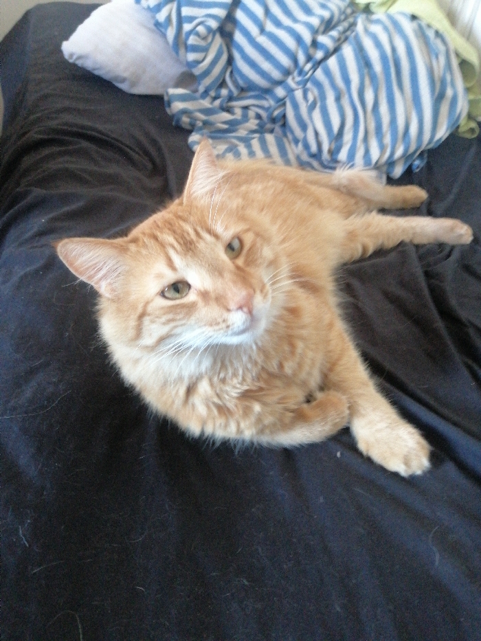 - "A ginger cat rests on a black bedsheet, its forepaws crossed" by FM-BsR653, licensed under CC BY 4.0