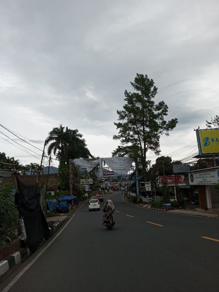 The image depicts a main road within the city of Adhanur, India, under an overcast sky. The asphalt roadway features two lanes for traffic moving away from the viewer, delineated by yellow dashed lines. In the right lane, a person wearing a beige headscarf and dark clothing rides a dark-colored scooter, heading away from the camera. Behind the scooter, in the left lane, a white compact sedan is also traveling in the same direction. Further down the road, additional vehicles, including a light-colored truck, are visible. Along the left side of the road, a black and white striped curb borders a vegetated area where a dark fabric or tarp is draped. Beyond this, a series of simple structures, some with blue tarpaulins, suggest small shops or stalls. A tall palm tree and multiple utility poles with a dense network of overhead electrical wires are prominent. A large, temporary archway constructed from scaffolding and covered with white and blue fabric spans the road in the mid-ground, displaying various affixed signs, one with red text. On the right side of the road, a paved shoulder leads to a tall, slender conifer-like tree. A prominent yellow billboard with a blue, stylized logo (resembling an '8' or intertwined 'S's) displays partially legible text including "SAMI..." and "COLL...". Below and extending along the street are various buildings and other signs, one of which clearly displays academic or professional titles such as "Dr. Hj. H. Muhammad S.Pd., M.Pd." The distant background reveals hills or mountains beneath the uniformly gray, cloudy sky. The overall lighting is diffuse, indicative of an overcast day.