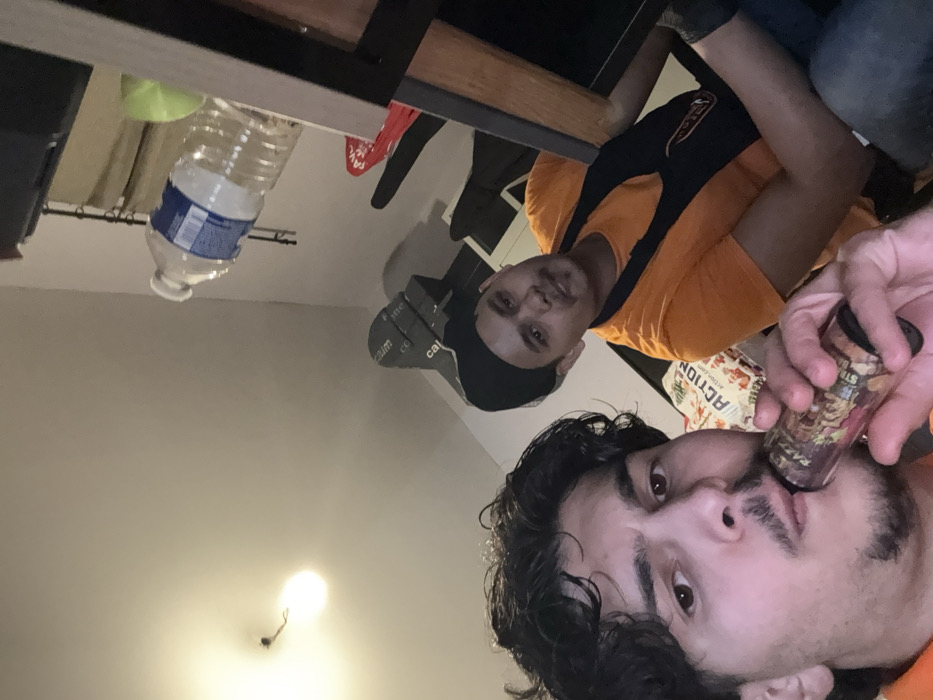 A forensic examination of the image reveals an indoor scene in Holtzheim, France, featuring two males. In the foreground, a male with dark, curly hair and facial hair (mustache and light beard) is visible from the chest up, looking directly at the viewer. He is wearing an orange top and is holding a colorful cylindrical vaping device to his mouth. In the background, to the right of the foreground subject, another male is seated. He wears a dark head covering, an orange short-sleeved shirt, and a dark apron with light-colored text on the chest. His left arm, gloved in dark material, is visible. He is also looking towards the viewer. The background environment consists of light-colored walls. A bare light bulb on a wire fixture illuminates the upper left portion of the scene. Above and to the right of the background subject, a clear plastic water bottle with a blue label rests horizontally on a surface, next to a partially visible red object. Below this, a white item with the word "ACTION" printed on it is discernible.