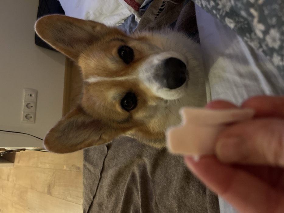 - "A tan and white corgi dog looks upward with focused attention at a hand holding pale, vaguely rectangular treats" by FM-4GKkh1, licensed under CC BY 4.0