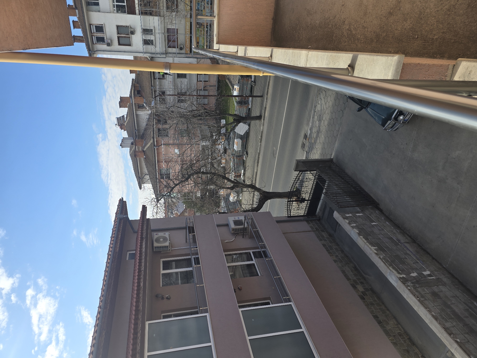 The image provides an elevated, high-angle view of a residential street and surrounding buildings in Sopot, Bulgaria, under a clear blue sky with scattered white clouds. In the immediate foreground, to the right, a section of a peach-colored building wall, a concrete ledge, and a silver metal balcony railing are visible. A yellow vertical pipe extends downwards along the right frame. Below the observer's level, partially visible in a concrete parking area, is the front section of a dark-colored SUV, possibly black or dark green, equipped with a chrome bull bar. Its license plate begins with "CT 90". To the left, a four-story building with a light brown-mauve facade is prominent. It features multiple white-framed windows and two external air conditioning units mounted below second and third-story balconies. These balconies are outfitted with silver metal railings. Below this building, a dark, ornate metal gate provides access to a property, while a low stone-block wall defines an adjacent concrete pathway leading downwards. The midground features an asphalt road with a solid white center line and a dashed white lane marker. The sidewalks are paved with hexagonal concrete blocks. Several bare deciduous trees line the street. On the opposite side of the road, white and orange/yellow construction barriers are erected, partially obscuring stacks of building materials. A single individual in dark clothing is walking on the sidewalk near these barriers. In the background, a cluster of buildings is visible. A multi-story white building with a brown-tiled roof is undergoing renovation, evidenced by extensive scaffolding covering its facade. A person in a high-visibility yellow jacket is positioned on this scaffolding. To its left, another building also has scaffolding. A sign with Cyrillic text, reading "КОМПЮТРИ" (Computers), is affixed to one of the structures in the background. A solar water heater array is visible on the roof of a more distant building.