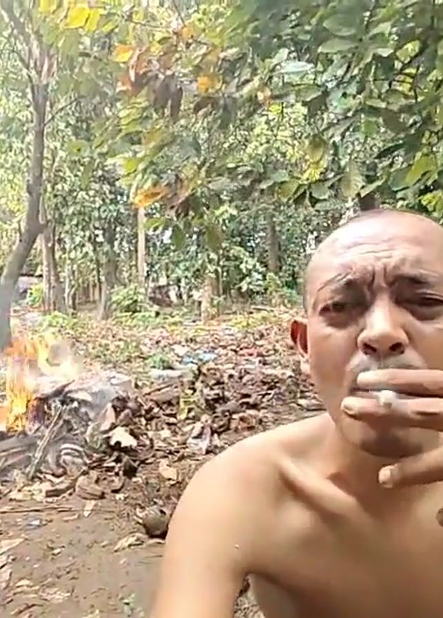 A shirtless man with a shaved head is holding a cigarette in his mouth while looking directly at the camera. He then exhales smoke toward the camera. Behind him is a burning pile of what appears to be trash and vegetation. The setting appears to be a wooded area or a yard with trees.