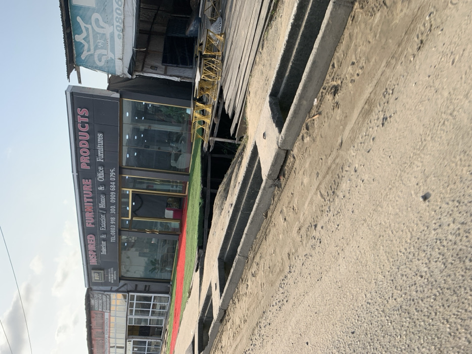 This image captures a daytime street-level scene within a commercial district in Lagos, Nigeria. The foreground consists of an unpaved dirt road exhibiting tire tracks and small debris, bordered by a multi-sectioned concrete drainage channel. In the midground, the primary structure is a modern, two-story building housing "Inspired Furniture Products," identified by its prominent dark signage and large, clear glass display windows revealing interior furniture arrangements. The entrance is accented with golden trim, leading to a red carpet extending onto an artificial green turf platform. To the immediate right of this building, a visible open canal or gap is spanned by wooden planks. On these planks, several gold-colored, geometrically designed table bases or small tables are displayed. Behind these items stands a makeshift commercial stall constructed with a corrugated metal roof and a tarpaulin wall, adorned with a large blue and white sign featuring a crown emblem and partial contact numbers. To the left of the "Inspired Furniture Products" building, a portion of another glass-fronted commercial building with white framing is visible. The background consists of a clear, light blue sky with minimal cloud cover. No individuals are visible performing actions or interactions within the frame.