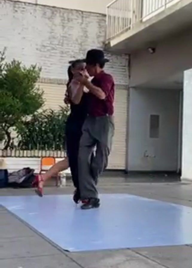 In a public area, a man and woman dance tango on a small, light blue stage set on a paved surface
