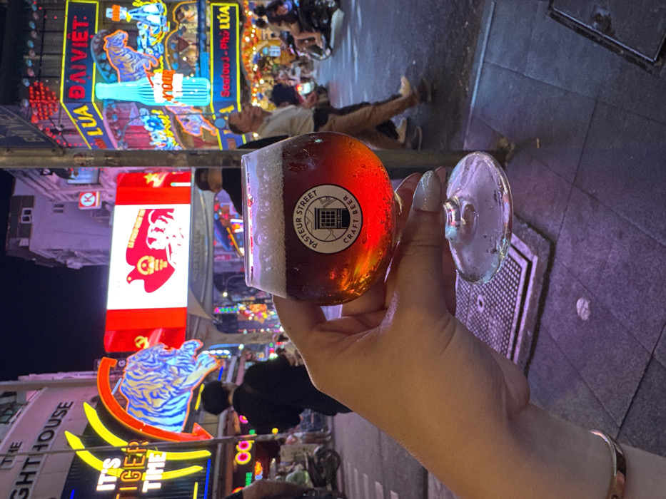 The image depicts a nighttime street scene in Ho Chi Minh City, specifically Bùi Viện Street in District 1, characterized by intense artificial illumination from numerous neon signs and LED screens. In the immediate foreground, a fair-skinned hand, exhibiting light-colored fingernail polish and a metallic wrist bracelet, holds a stemmed glass containing a reddish-amber craft beer with a visible foam head. The glass features a circular logo that reads "PASTEUR STREET CRAFT BEER" enclosing an illustration of a building. The background shows a bustling urban environment. To the left, a building facade displays multiple neon signs, including "THE LIGHTHOUSE," "IT'S TIGER TIME" accompanied by a blue neon tiger head, and a partial "OG" sign. To the right of center, a large LED screen broadcasts communist-era propaganda imagery on a red background, featuring a white silhouette of a fist clutching a hammer and sickle, alongside figures of workers. Adjacent to this, another multi-story building is heavily adorned with vibrant neon signage, prominently featuring "BÚN LUA ĐẠI VIỆT" with large blue neon bottle and tiger graphics. The street and sidewalk below are populated by multiple individuals walking and standing. Several motorbikes are visible, some with riders, indicating active vehicle traffic. The ground surface consists of gray paving stones, with visible drain covers. The overall atmosphere is that of a lively entertainment district.