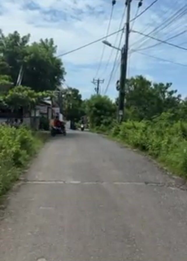 narrow paved road stretching into the distance under a partly cloudy sky. Utility poles line the road, with numerous wires crisscrossing overhead. Lush green vegetation grows on both sides of the road, and glimpses of small buildings can be seen amongst the foliage. Two scooters are visible in the distance, approaching the camera. The closer scooter has two people on it.
