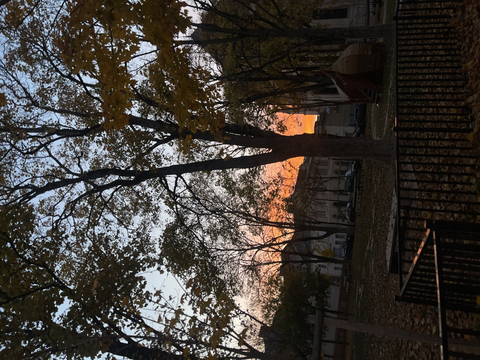 A golden sunset peeks through a canopy of trees, casting a warm glow on buildings in the distance. The branches are mostly bare, with some yellow leaves still clinging on. A park scene is visible, with fallen leaves scattered across the grass, and a wooden structure that might be part of a playground. A dark, metal fence and stairway are on the right side of the frame, adding depth to the shot.