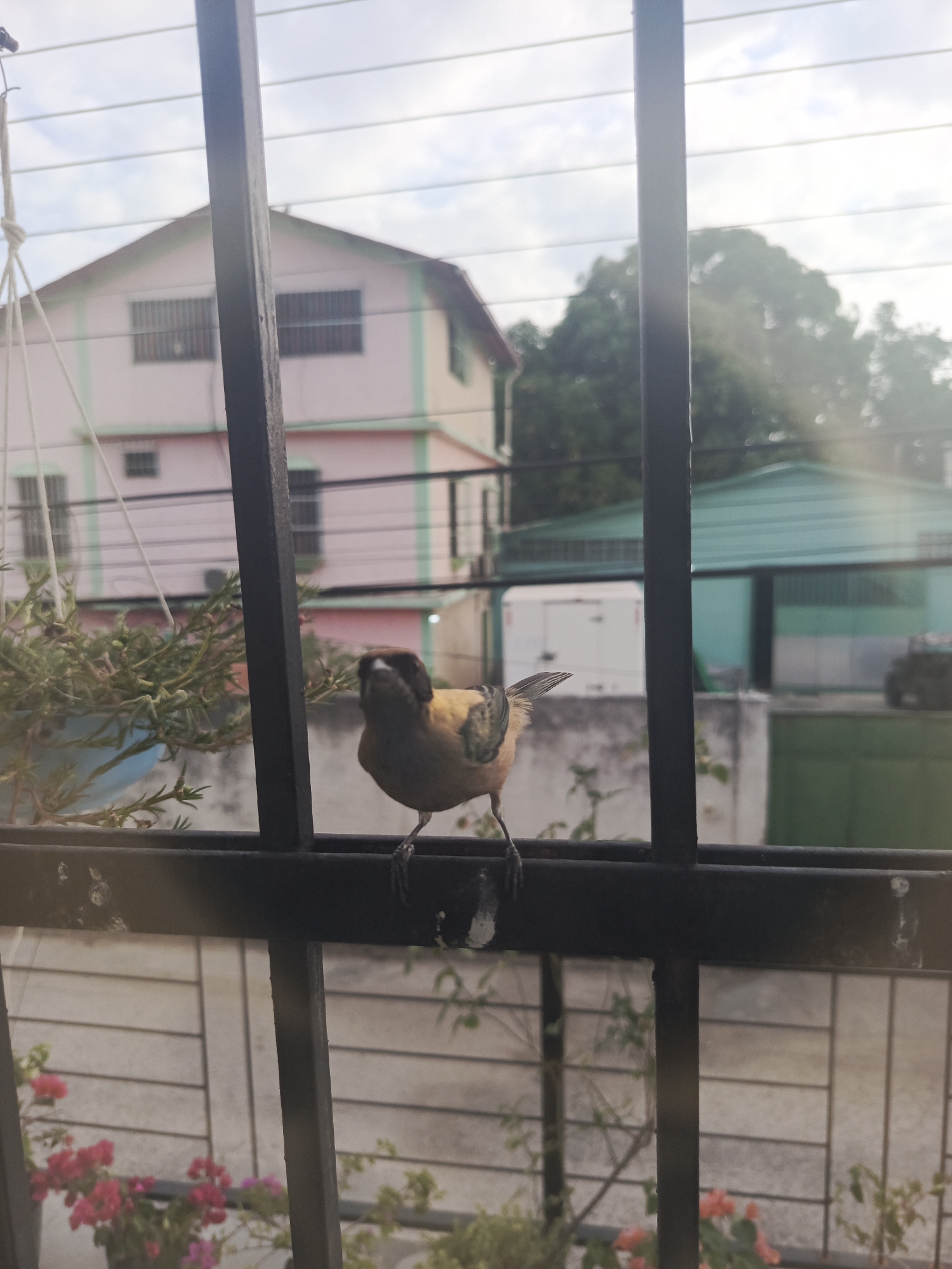 A bird is perched on a black metal railing in Tinaquillo, Venezuela. The bird has a brown head, yellow breast and grey wings, and it faces the camera. Behind the railing are several plants in pots, including one with red and pink flowers at the bottom, and another with green foliage on the left side. In the background, there are two houses: one is a two-story building painted pink with green trim, and the other is a single-story building with a green roof. Additionally, there is a white generator and a green fence. Sunlight is visible in the upper right of the frame.