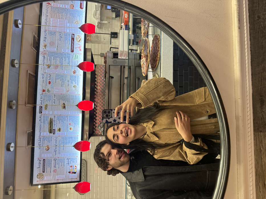 The image depicts an interior scene, likely in a pizzeria or casual eatery, in New York, United States. In the foreground, two individuals are reflected in an oval-shaped mirror with a light-colored, possibly pinkish-white, decorative frame. A female is positioned to the right, holding a smartphone with a blue and white star-patterned case in her right hand to take a mirror selfie. She has long, dark hair, wears a tan or light brown suede-like jacket, and has rings on her right hand. Her tongue is extended. To her left and slightly behind her is a male with dark, curly hair and stubble, wearing a black leather jacket over a dark top. His tongue is also extended, mirroring the female's playful expression. The background, visible in the mirror's reflection, reveals a commercial kitchen and dining area. A large, illuminated menu board displays various food items including sandwiches, cheesesteaks, hamburgers, pasta, salads, hot and cold subs, wraps, pizza rolls, desserts, and drinks, with corresponding prices and small photographic representations. Five red, teardrop-shaped pendant lights hang from the ceiling in front of this menu board. Below the menu, a glass display counter holds several large, round pizzas with different toppings. Behind this counter, stainless steel commercial kitchen equipment, including what appears to be a pizza oven, is visible. The wall behind the counter features white subway tiles on the upper section and darker, possibly black or grey, tiled wainscoting below. Several white pizza boxes are stacked on a shelf in the background.