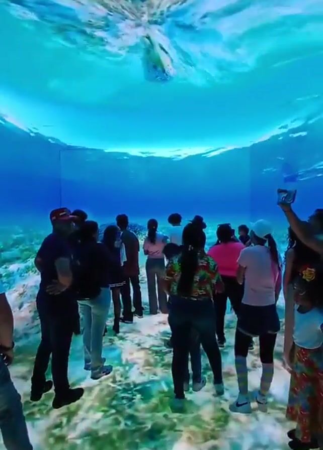 A group of people are standing in a room with an immersive ocean scene projected onto the walls, floor, and ceiling