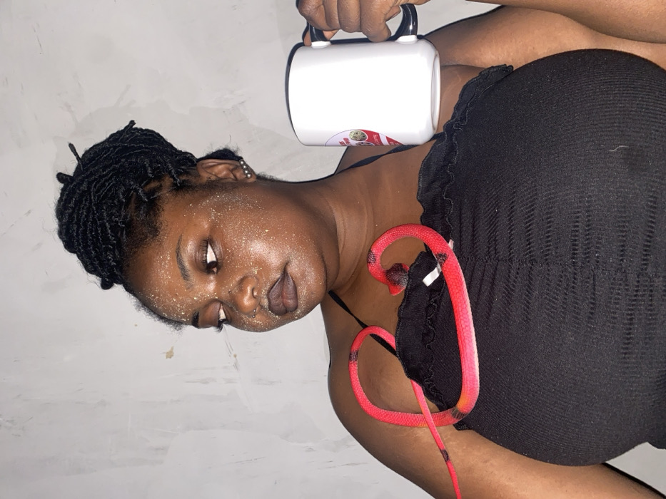 A dark-skinned woman with locs holds a white mug. Glitter dusts her face, highlighting her dark eyes and lips. She wears a black top, and a red and black toy snake curls near her collarbone. The image is rotated, making the subject appear sideways against a mottled gray wall.