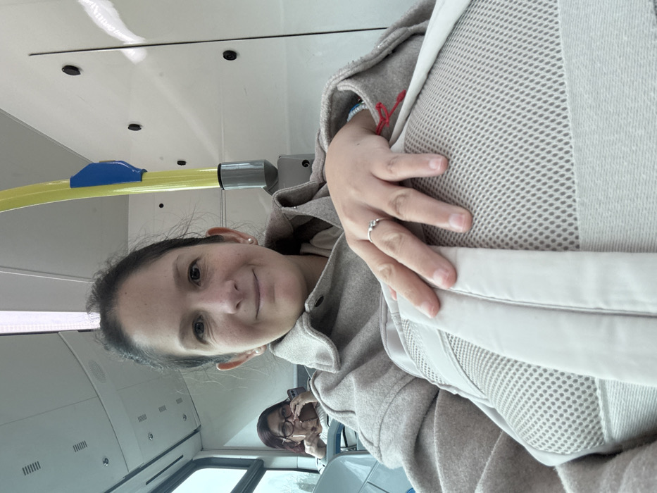 A woman with dark hair and a ring on her finger is on public transport wearing a grey coat and a baby carrier. She smiles at the camera. A yellow grab rail is visible above her. In the background, a woman with glasses is seated, holding a phone. Outside the window, the scenery is visible.