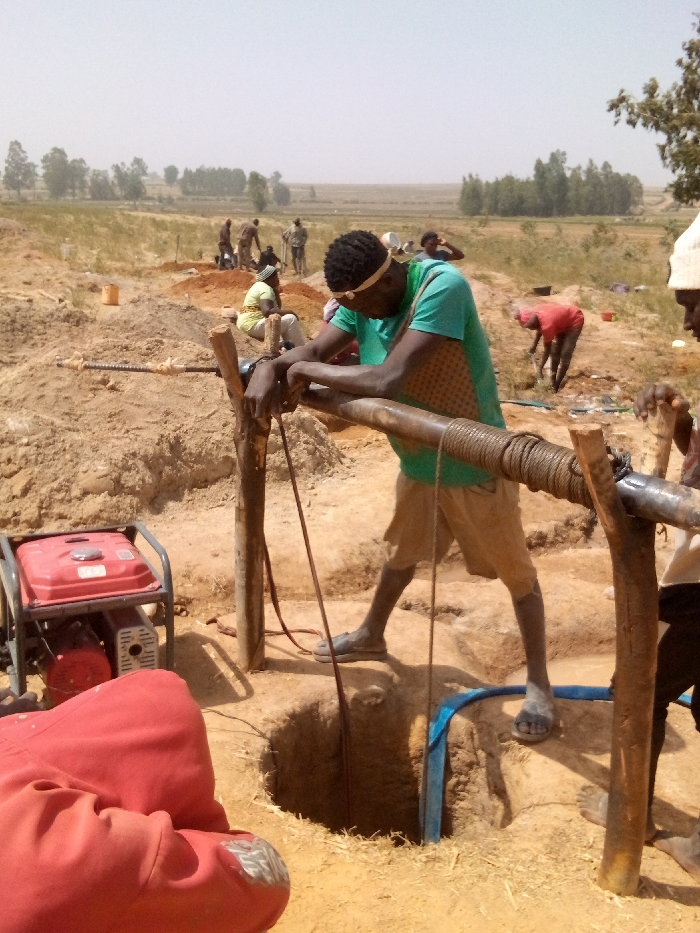 The image depicts an active outdoor excavation site in South Ropp, Nigeria, under a bright, hazy sky. The terrain is characterized by dry, reddish-brown, disturbed earth with numerous mounds of excavated soil and several deep, irregular pits. In the central foreground, a Black male, wearing a green t-shirt, light-colored shorts, sandals, and a light-colored headband, leans forward with his hands resting on a horizontal wooden beam. This beam is part of a rudimentary winch or pulley system, supported by two vertical wooden posts. A rope or cable is coiled around the horizontal beam and descends into a dark, circular pit directly below. To the left of the winch system, a red and black portable generator or pump is positioned on the ground. A blue hose or pipe extends from this unit towards an excavated area, possibly for water management or material conveyance. Another individual, wearing a light-colored cap, is partially visible to the right of the winch, with hands near the wooden beam. A person in a red garment is partially visible in the lower left foreground. In the midground, approximately eight to ten additional individuals are distributed across the site, engaged in various manual labor activities. One person, wearing a yellow shirt and a white head covering, is seated on a mound of earth. Others are seen actively digging with shovels or similar tools, moving earth, or standing near other excavated sections. Specifically, an individual in a red shirt is bent over, engaged in digging within a shallow pit. The background consists of flat fields with sparse green vegetation, transitioning into a distant horizon marked by a line of trees. The overall scene suggests an ongoing artisanal mining or large-scale manual excavation operation.