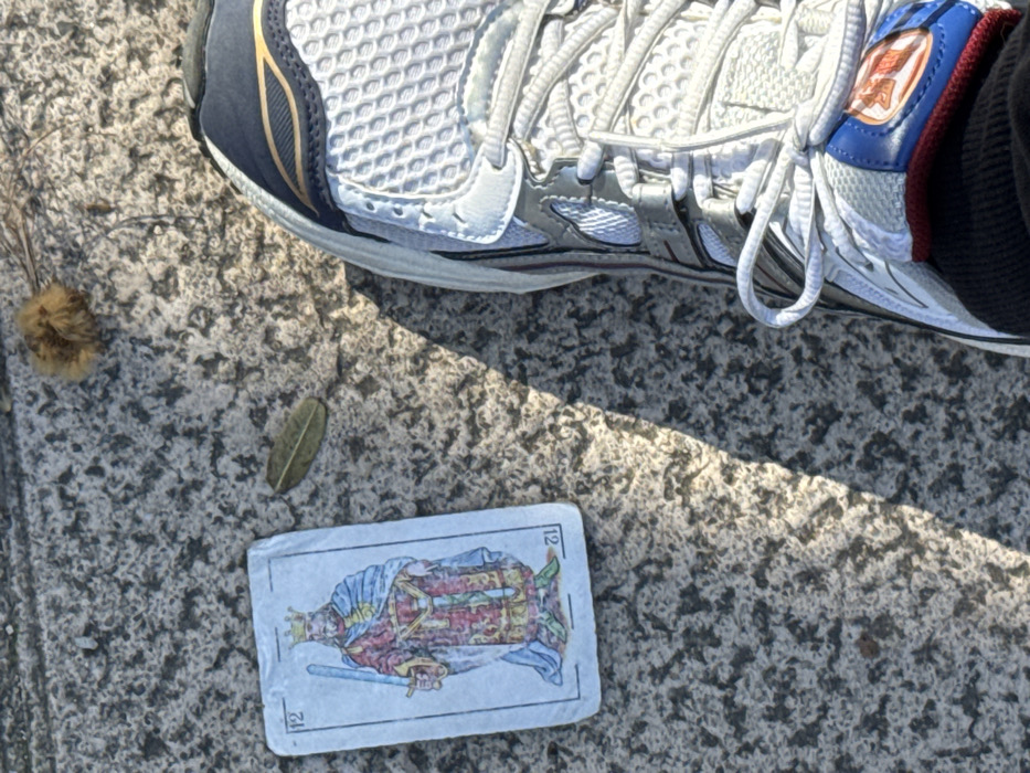 The image displays an overhead view of a textured ground surface, identified as a location in L'hospitalet De Llobregat, Spain. The ground appears to be light grey, speckled pavement, possibly concrete or asphalt, illuminated by direct sunlight which casts a prominent shadow across the central and lower-right portions of the frame. In the lower right quadrant, a human left foot is visible, clad in a white, grey, and dark blue athletic shoe with white laces and a mesh upper. A small blue and red patch adorned with an orange emblem is attached near the shoe's ankle, just above a visible black ribbed cuff. To the left of the shoe, a single playing card from a Spanish deck rests flat on the pavement. The card depicts a crowned male figure holding a sword, consistent with the "King" card, and bears the number "12" in its top-left and bottom-right corners. The card shows signs of wear. Adjacent to the playing card, a small, dried, olive-green leaf is present on the ground. In the upper right area, a dried, light brown, fluffy seed head or plant detritus is also visible.