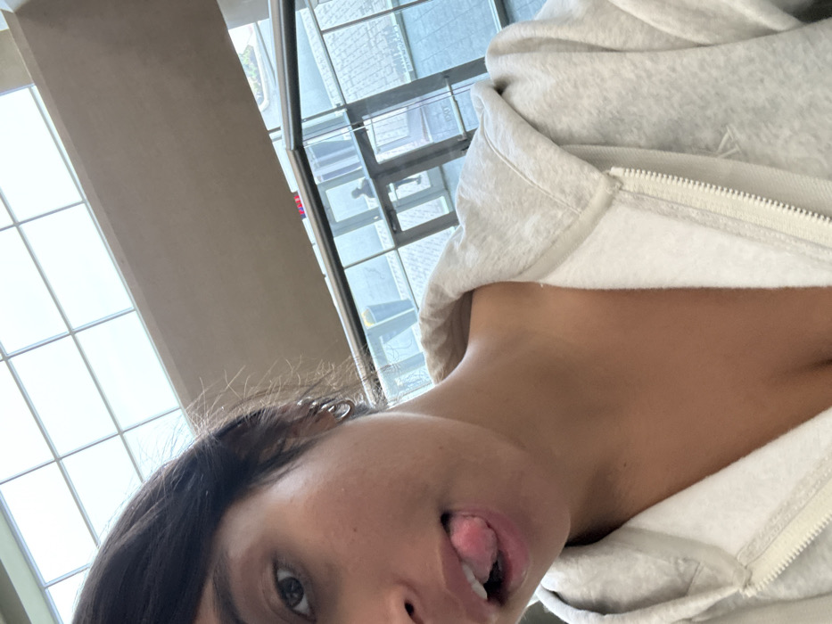 The image depicts a close-up selfie of a female individual, foregrounded, with her dark hair pulled back. She has tan skin, dark eyes, and multiple silver hoop earrings in her visible left ear. Her mouth is slightly open, and her tongue is partially extended. She is wearing a light grey, full-zip hooded sweatshirt, which is unzipped to reveal her chest. The background shows a contemporary indoor environment. Overhead, a large grid-patterned skylight ceiling allows natural light. Below the ceiling, a wide, light-colored (possibly beige or off-white) architectural beam or wall runs horizontally. Further back, large glass windows or panels provide a view to an exterior paved area and reflect interior elements. A faint silhouette of an individual, possibly in a uniform, is visible through the glass near an entry/exit point, above which a red "EXIT" sign is partially discernible. The overall architectural style, including the expansive glass and public area appearance, strongly indicates the Penn Medicine Princeton Medical Center, located in Plainsboro Township, New Jersey, United States.