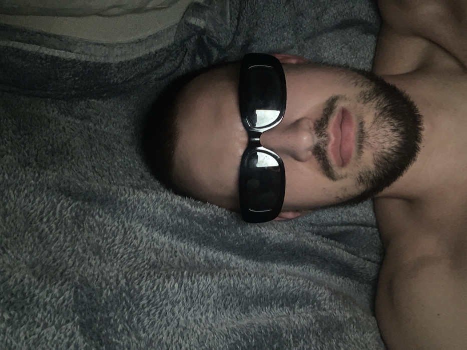 A male individual is depicted in a close-up, overhead shot, lying on a grey, textured blanket or similar fabric in a dimly lit indoor environment in Sofia, Bulgaria. The individual has short dark hair, a beard, and a mustache, and is wearing dark, rectangular-framed sunglasses. The upper part of his bare torso is visible. The subject is looking directly towards the camera. No specific actions or interactions with other subjects or objects are apparent beyond the subject's pose.