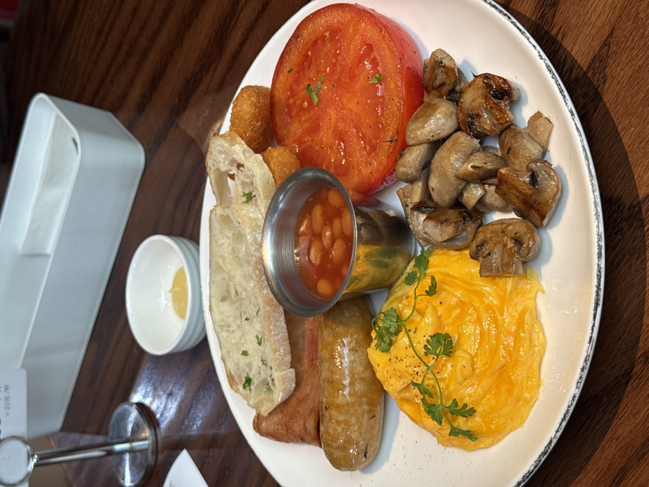 This image depicts a close-up, slightly overhead view of a prepared breakfast platter set on a dark brown wooden table in Futian District, China. No people are visible. The central subject is a white circular ceramic plate with a textured dark rim, holding a diverse meal. Clockwise from the bottom left: - A generous serving of bright yellow scrambled eggs or a folded omelette, garnished with fresh green parsley and black pepper. - A cluster of sautéed brown mushrooms. - A thick, red slice of grilled tomato, garnished with fresh green parsley. - Two small, golden-brown fried items, resembling hash brown bites. - Two slices of lightly toasted bread, possibly baguette or ciabatta, garnished with fresh green parsley. - A large browned sausage. - A small, cylindrical stainless steel cup filled with baked beans in a red tomato sauce, centrally positioned on the plate. In the background, on the dark brown wooden table: - A small white ceramic bowl contains a dollop of yellow condiment, likely mustard. - A white rectangular container, possibly for dining accessories, is positioned behind the small bowl. - A chrome menu stand, partially visible on the far left, displays fragmented Chinese text and numerical characters.