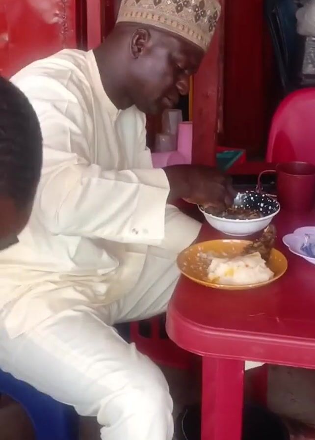 A man of color, wearing a cream-colored traditional outfit and a patterned hat, is seated at a red plastic table on a blue plastic chair. He is in the process of eating a meal. On the table are two bowls and a plate: one bowl contains a dark stew, the other appears to be a side dish with black and white spots. The plate holds a portion of a white, mashed food, topped with what looks like a piece of chicken. The man is using his hands to eat from the stew. A black bucket is visible underneath the table. The background appears to be the interior of a small eatery or roadside restaurant, with red paint or decor visible on the walls. Another red plastic chair can be seen in the background. There is a brief exchange between the man and another voice which is not visible.