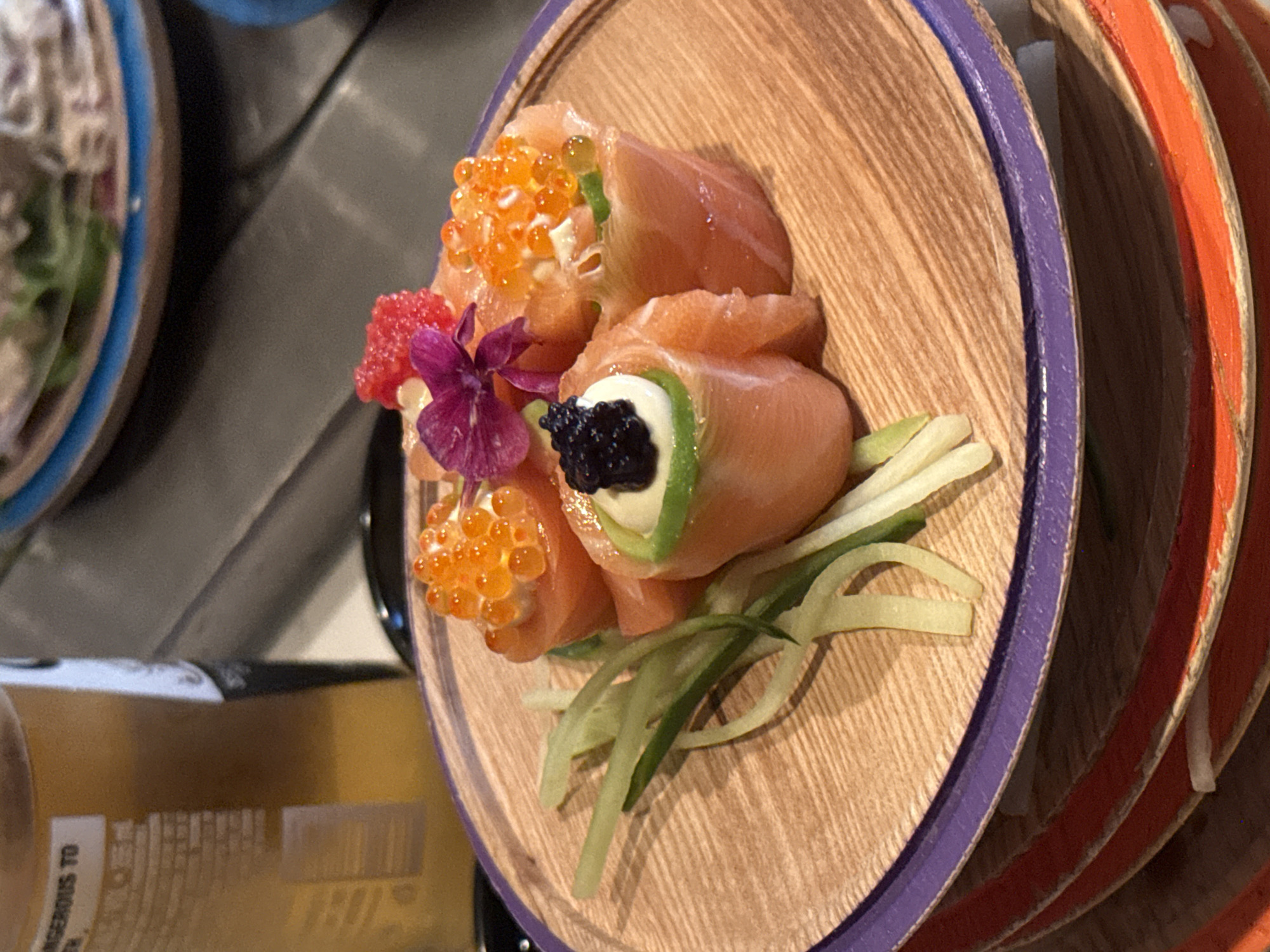 - "A close-up photograph displays a culinary arrangement of four salmon-based sushi rolls presented on a round, light-toned wooden plate featuring a purple outer rim" by FM-qzRJ63, licensed under CC BY 4.0