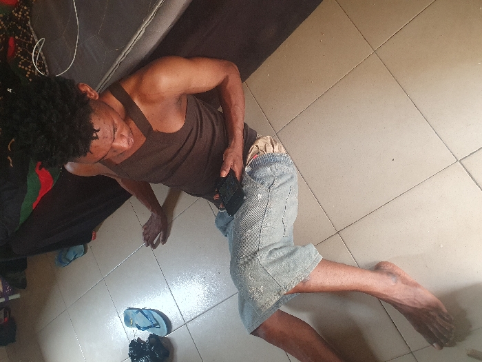 A male individual is depicted seated on a light-colored tiled floor, identified by square ceramic tiles with dark grout lines. He has short, dark, curly hair and a dark skin tone. The individual wears a dark brown tank top and light blue denim shorts, with light-colored underwear visible above the shorts' waistband. He is barefoot. His right hand rests flat on the floor beside him, while his left hand holds a black, rectangular electronic device, which he observes with his gaze directed downwards. To the left of the individual, on the floor, a pair of light blue flip-flops and a black, possibly crumpled object are present. Along the right side of the scene, a dark, low-lying padded surface, consistent with a mattress or a low bench, is visible. Beneath this surface, dark fabric or bedding is draped, revealing hints of red and green textiles. The scene is illuminated by ambient indoor lighting, casting soft shadows. The specific location within Lokoja, Nigeria, cannot be determined from the visual information provided in the image.
