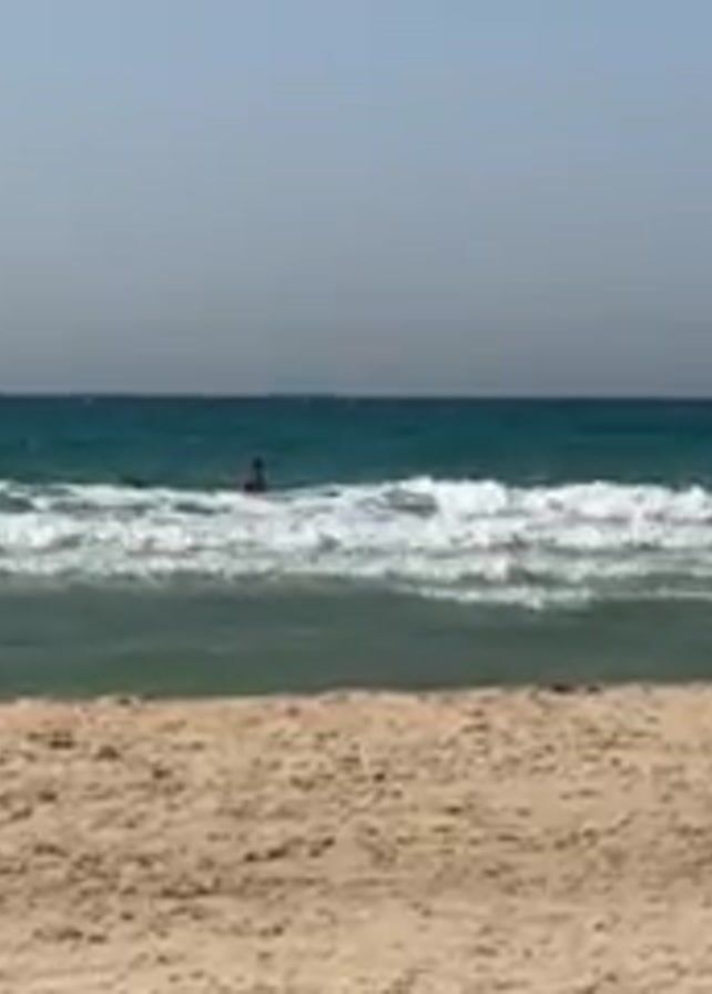 sandy beach with three people swimming in the ocean. The water is turquoise with white waves. The sky is light gray. The sand is tan and undisturbed in the foreground.