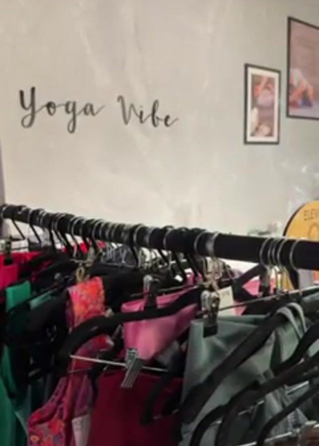 A low-angle shot shows a clothing rack at a shop called Yoga Vibe