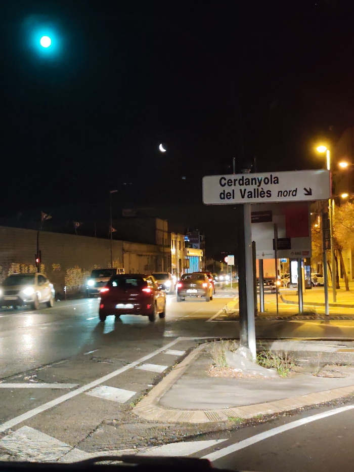 A nighttime scene captures a road with several cars driving. A sign indicates the direction to "Cerdanyola del Vallès nord." The road is wet, reflecting the car headlights. Above, a crescent moon is visible, along with a bright, round light, possibly the moon or a streetlight. Streetlights illuminate the buildings and sidewalks. The view appears to be from inside a vehicle.
