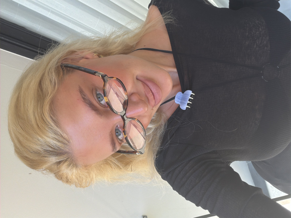 A fair-skinned woman with blonde, wavy hair and blue eyes is wearing glasses with a brown tortoiseshell frame. She is wearing a black, form-fitting top and a light blue hair clip hanging from a black cord around her neck. The background includes a window with blinds and a hint of natural sunlight. The photo is slightly angled, with the woman positioned towards the left side of the frame.