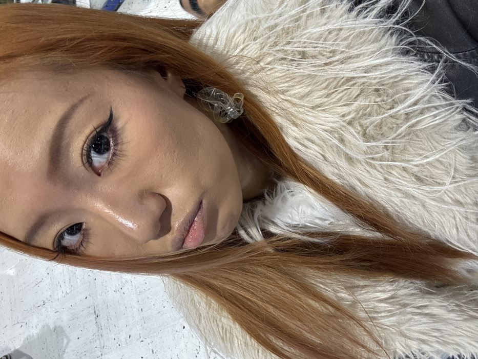 A striking portrait of a woman with light brown hair, adorned with a fluffy white faux fur collar. She gazes upwards with glossy, lined eyes and a subtle, pink lip. Delicate, transparent earrings accentuate her features. The lighting highlights the contours of her face, giving it a radiant glow. The image has a soft, slightly tilted perspective.