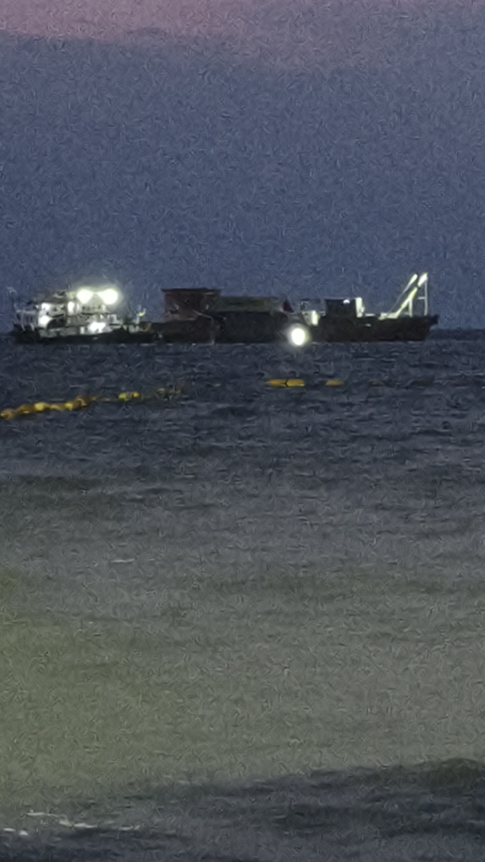 The image displays a coastal marine environment in Pattaya City, Thailand, during twilight or early night. Two large work vessels are situated in the mid-ground on the water. The vessel on the left is brightly illuminated by multiple white lights on its upper structure. The vessel on the right exhibits a single prominent white light directed forward from its bow and an angled A-frame structure towards its stern. A continuous line of yellow buoyant objects, likely buoys or floats, extends horizontally across the water in the immediate foreground, positioned closer to the viewer than the vessels. Two additional, smaller, discrete yellow buoys are visible further to the right, beyond the main line of floats. The water surface shows ripple patterns. The sky above is dark blue, transitioning to a subtle pink and purple hue at the very top of the frame. No individuals are visible. The scene indicates active maritime operations.