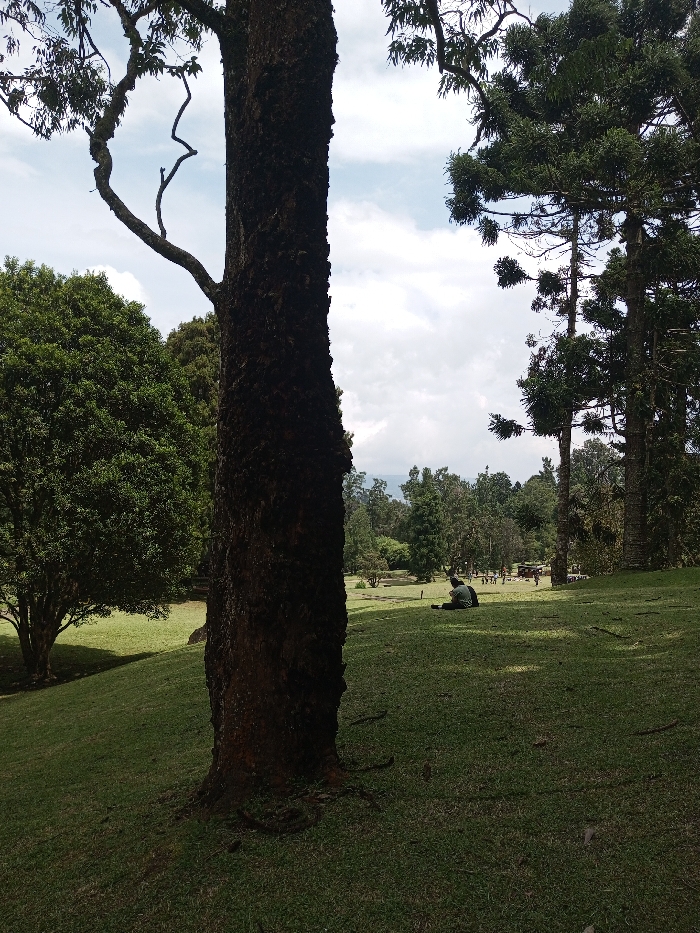 A large, rough-barked tree dominates the foreground, partially obscuring a grassy field. Sunlight dapples the grass, illuminating two people sitting together, with others gathered in the distance. A large, leafy tree stands to the left and tall, slender trees are on the right. The sky is overcast, with patches of blue visible between the trees.