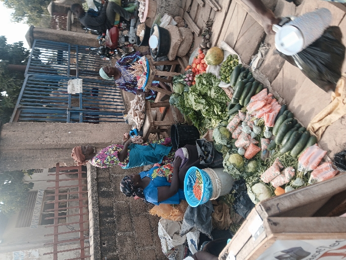 A bustling outdoor market features vendors selling fresh produce. Three women, wearing colorful clothing and head coverings, sit near a variety of vegetables and fruits, including cucumbers, tomatoes, and leafy greens. Their wares are displayed on the ground and on makeshift tables. Behind them is a blue gate, a stone wall, and a parked motorcycle, suggesting a location near a residential area. The scene conveys a lively atmosphere of commerce and community.