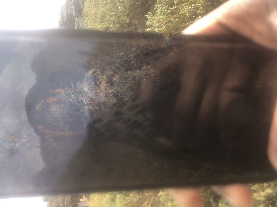 The image displays a vertical orientation of a dark, reflective rectangular object, likely a smartphone screen, held by a human hand