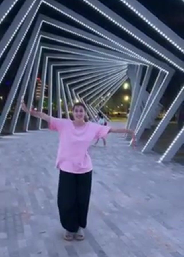 A low angle shot shows a woman in a pink t-shirt and black pants with arms outstretched smiling in an outdoor space. Overhead is a tunnel-like architectural structure made of gray frames lined with white LED lights. The structure is shaped of multiple triangular frames of decreasing size to give the impression of distance. The woman has dark hair pulled back, and fair skin. The space is paved with gray paving stones. In the background are a few other people walking, streetlights, and buildings in the distance. The sky is dark. The video appears to be taken in the evening. A whooshing sound is audible.