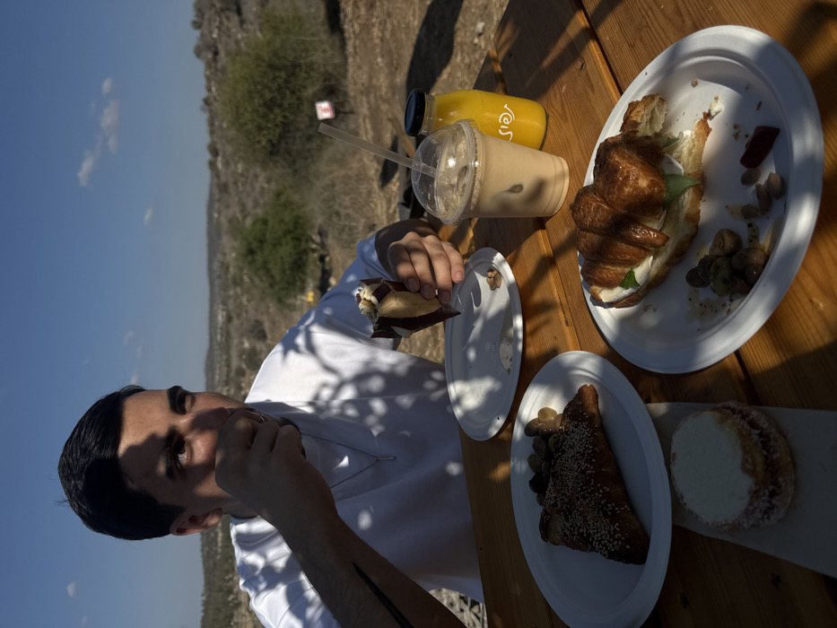 A male individual is seated at a light brown wooden picnic table, eating an outdoor meal under a clear blue sky in the Mate Yehuda Regional Council, Israel. He has dark hair, wears a white t-shirt with a silver necklace, and his left forearm displays a dark tattoo. He holds a partially unwrapped pastry or sweet roll in his right hand, bringing his left hand toward his mouth. Shadows from overhead foliage fall across his face and body. On the table, from left to right, are a small round dessert (possibly a macaron), a white paper plate holding a triangular pastry topped with sesame seeds and green olives, and another white paper plate containing a croissant filled with white cheese and green leaves, accompanied by olives and red pepper strips. A tall plastic cup with a straw holds an iced coffee, and a small glass bottle with a black cap contains orange juice, partially labeled in Hebrew. An empty or partially eaten white paper plate is visible between the male subject and the food items. The background shows a dry, scrubland landscape with sparse vegetation and rolling hills under a bright sun.