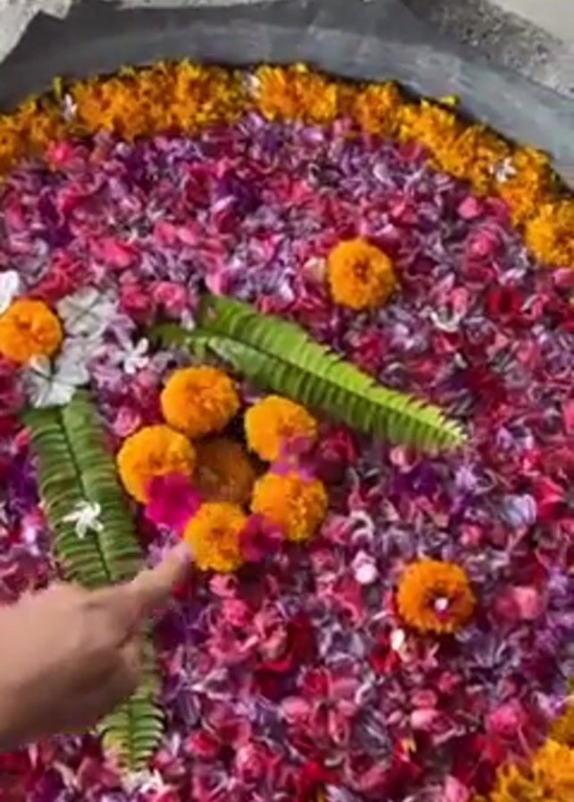 large, shallow stone basin filled with water and flower petals. The petals are primarily in shades of pink and purple, with an outer ring of orange marigolds. Several clusters of orange marigolds are placed in the center, along with long green leaves. A hand briefly enters the frame to adjust one of the marigold clusters. The basin is sitting on a tiled floor. There is water moving in the basin.