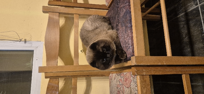 - "An indoor scene in Sofia, Bulgaria, depicts a Scottish Fold cat resting on a wooden chair" by FM-kFPo93, licensed under CC BY 4.0