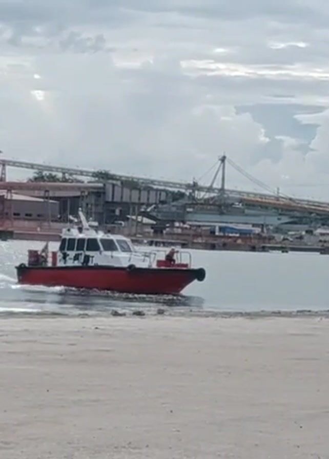 A red and white boat is moving in the water. In the background, there are industrial buildings, structures, and a crane. The sky is overcast. There is a concrete area in the foreground. A mooring bollard is visible on the edge of the concrete.