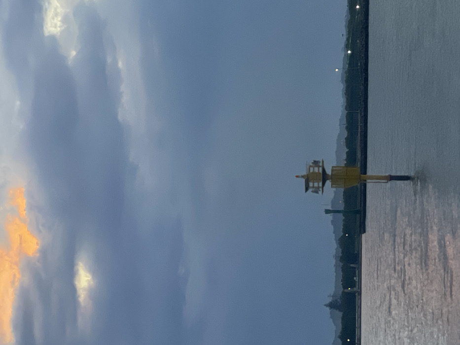 The image displays a maritime environment in Lhokseumawe, Indonesia, captured under a predominantly overcast sky. A prominent yellow marine navigational beacon stands vertically in the water, occupying the lower-middle portion of the frame. This beacon features a cylindrical shaft emerging from the water, supporting a wider, multi-tiered upper structure equipped with various instruments and topped by an orange conical marker. The water surface, displaying subtle ripples, reflects diffuse light. In the mid-ground, a dark, vegetated landmass, consistent with a coastline or island, stretches horizontally across the scene. Visible on this land are several structures: a tall, slender, dark green tower-like object positioned to the left of the yellow beacon, and a darker, low-lying structure resembling a breakwater or pier extending into the water from the right. Distant hills or elevated terrain are faintly discernible behind the immediate landmass. The sky is dominated by extensive dark blue-gray cloud cover. A distinct, irregular opening in the clouds in the upper left quadrant reveals a bright orange and yellow glow, indicating a localized illumination source, likely the sun's position during sunrise or sunset. Additional, less intense patches of light are visible through the clouds in other areas of the sky. No individuals, explicit actions, or interactions are present within the scene.