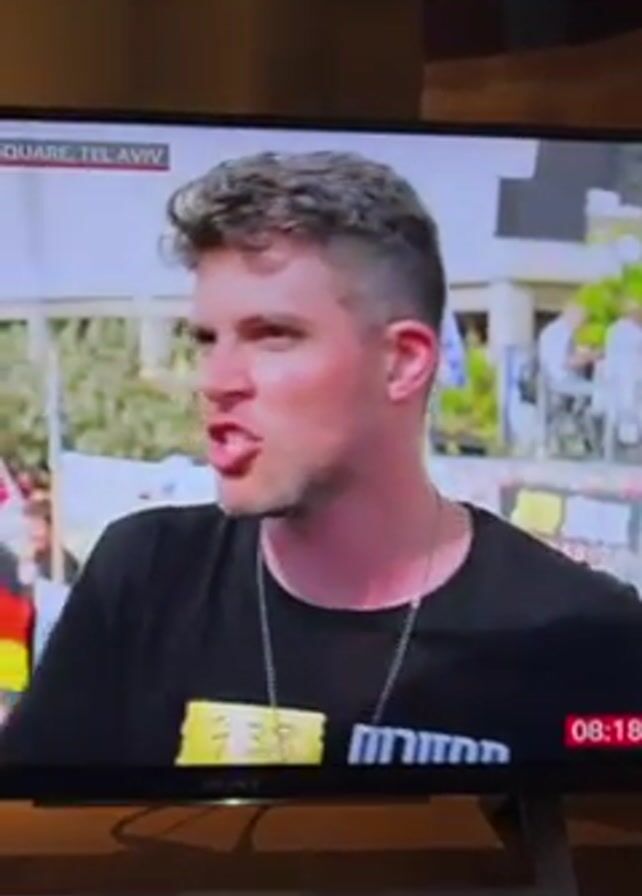 A man in a black T-shirt with writing on it is being interviewed on television. He is standing outside and speaks in earnest. The television is a Sony brand, and there is a remote control on the surface below it. A timecode in the corner of the screen indicates 08:18. The location is identified as Kings Square, Tel Aviv.