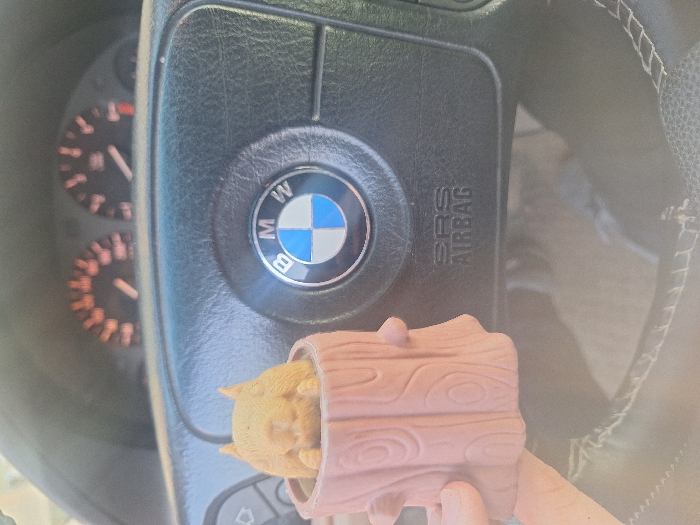 The image displays the interior of a vehicle, primarily focusing on the steering wheel and dashboard. A human hand, with visible fingers, holds a light brown, textured figurine that depicts a squirrel emerging from a tree stump. This figurine is positioned centrally in the foreground, against the backdrop of a black, four-spoke steering wheel. The steering wheel prominently features the BMW logo in its center, characterized by blue and white quadrants within a black ring. Below the logo, "SRS AIRBAG" is embossed. The rim of the steering wheel exhibits black material with visible white stitching. In the blurred background, beyond the steering wheel, two circular analog gauges with orange backlighting are partially discernible, consistent with vehicle instrumentation. No complete individuals are visible. The specific location within the city of Burgas, Bulgaria, cannot be determined from the visual information provided, as the scene is confined to the vehicle's interior.