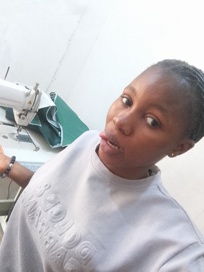 A female subject with dark skin and dark braided hair is depicted in a medium shot, facing the camera with a playful expression, her tongue slightly extended. She is wearing a light grey long-sleeved shirt with embossed lettering and a multi-colored beaded bracelet on her left wrist. Small gold stud earrings are visible. In the background to the left, a white industrial sewing machine is visible, with green and white fabric draped over its table. A measuring surface with numerical markings is present on the table. The environment consists of plain white walls, suggesting an indoor workshop or tailor shop. The location is an unidentifiable indoor commercial space within the city of Unknown, Unknown.