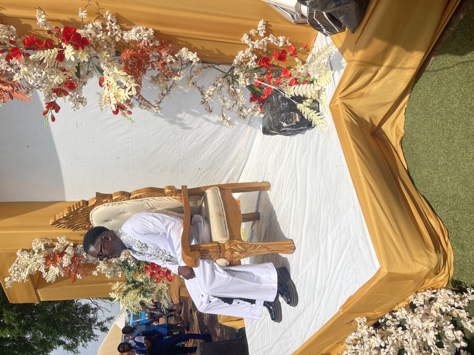 A man is seated on an ornate, cushioned chair positioned against a backdrop of white and gold draped fabric adorned with floral arrangements. The man is wearing a white robe-like garment and black shoes. Below the draped fabric, a group of people can be seen, suggesting an audience or gathering. The environment seems to be outdoors, indicated by the natural light and the presence of grass and trees at the edges of the frame.