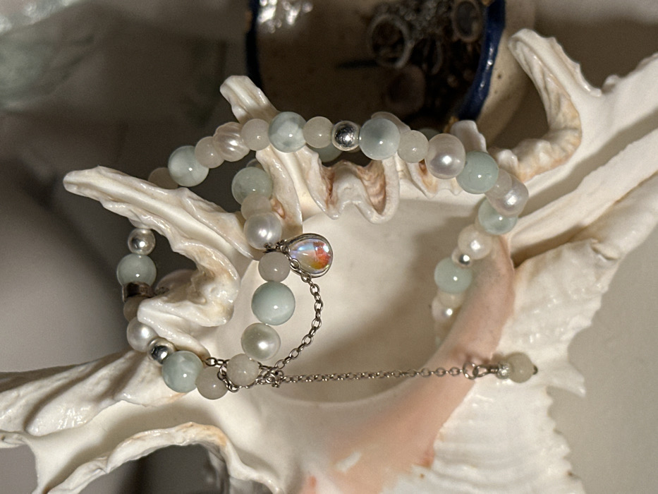 A multi-strand beaded bracelet is depicted, composed of numerous spherical beads. These beads are primarily light blue-green and off-white, interspersed with small, spherical silver-toned spacer beads. A silver-toned chain dangles from a segment of the bracelet, terminating in a small, elongated, iridescent teardrop-shaped charm exhibiting refractions of orange, pink, yellow, and blue. A second similar iridescent charm is attached directly to the bracelet via a short link. The bracelet is draped over a large, off-white gastropod seashell with faint peach interior accents and prominent external ridges, which serves as a display stand. The background is blurred and dark, revealing a partially visible blue and white container on the right, which holds several indistinct metallic objects. The scene is located in Šušanj, Montenegro.